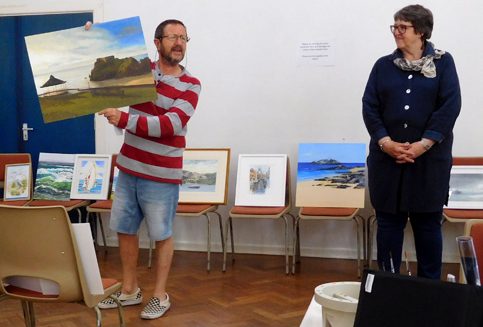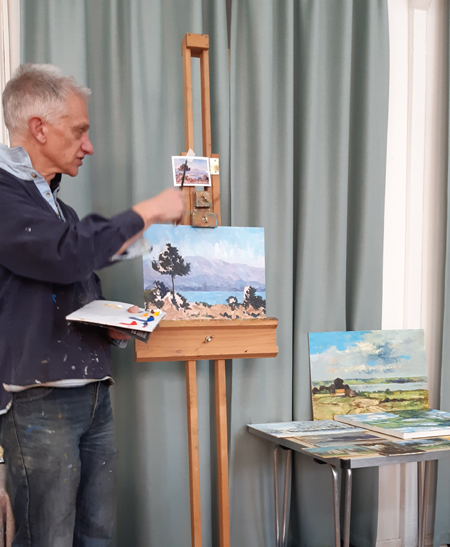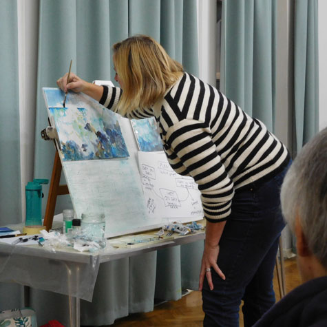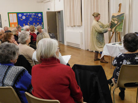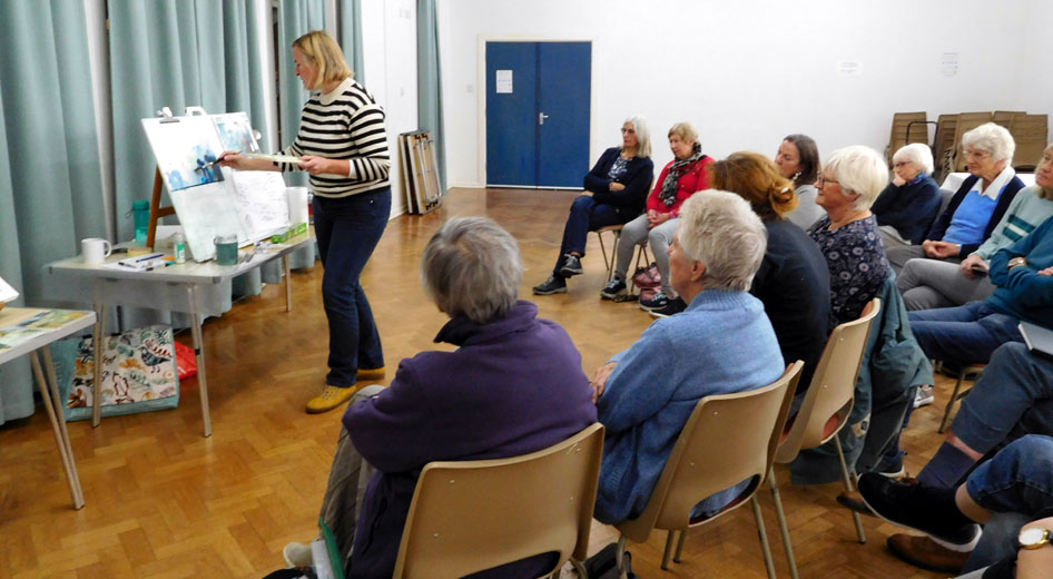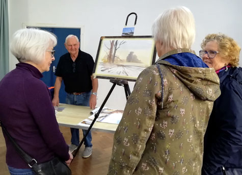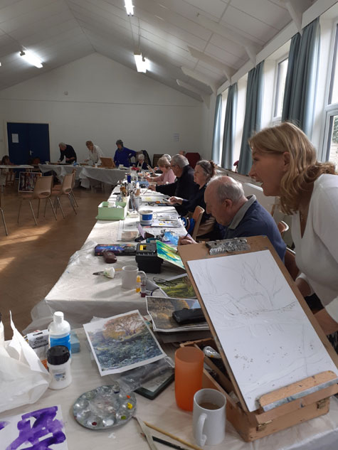 The Thursday art group meets every Thursday morning from 9.30am - 12.00. It's very informal and includes all abilities. Every few weeks we have a visiting professional artist to either do a demonstration or a workshops On 9th November Valerie Pirlot gave a demontration of her landscape technique and the first one next year is Paul Oakey on 1st February. There is usually a still life set up and sometimes we have a model for life drawing. This year we finish on 7th December and we start again on 4th January 2024.